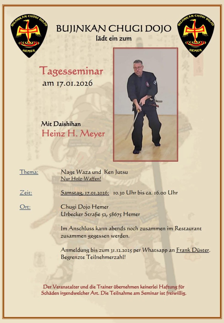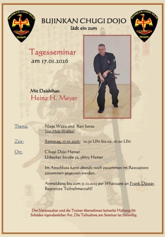 Seminar mit Dai SDhihan Heinz H. Meyer im Bujinkan Chugi Dojo Hemer am 17.01.2026
